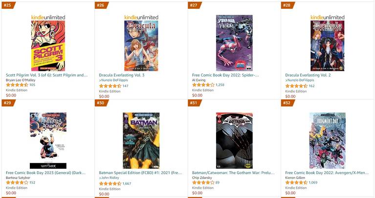 Ada banyak sekali komik gratis yang tersedia. Mulailah dari daftar Komik dan Novel Bergambar Terlaris, lalu klik 100 Gratis Teratas untuk melihat judul gratis terpopuler yang tersedia untuk diunduh. Itu DC, Marvel, Dark Horse, Image, dan masih banyak lagi.