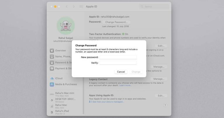 Masukkan kode sandi perangkat atau kata sandi admin macOS Anda dan klik Lanjutkan . Masukkan kata sandi baru, masukkan kembali di bidang Verifikasi , dan ketuk Berikutnya atau klik Ubah . Kata sandi Anda sekarang diubah. Anda mungkin perlu memasukkannya kembali di sejumlah lokasi.