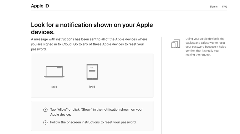 Seperti login 2FA, kotak dialog muncul di perangkat tepercaya Anda. Daftar perangkat Apple Anda juga muncul di situs web. Klik atau ketuk Izinkan di pesan Atur Ulang Kata Sandi .